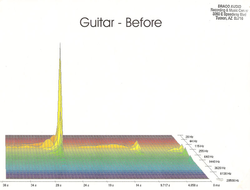 Guitar: In the photos of the Guitar Before and Guitar After, we see the opposite effect. For these photos, a chord was played. The predominant frequency of that chord shows up as yellow, and the other colors represent additional harmonics. Notice in the After photo, though, that there is a change in these other colors—there is a lot more of each of these colors, meaning that more of the chord's harmonics are now emanating from the guitar. VortexHealing had the effect of amplifying the additional harmonics of the chord, creating a fuller, richer sound in the guitar. There are even some additional harmonics at the top, in the dark red band that were not there at all in the Before photo.